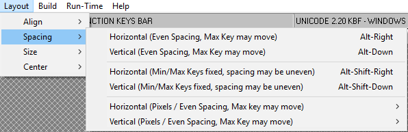 The Layout Menu has several sub-menus with options to align, space, size, and center selected keys.