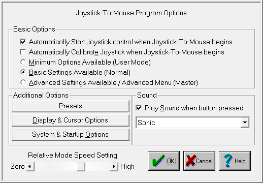 This setting enables all of the advanced features within Joystick-To-Mouse, and enables the Advanced Menu. This setting is primarily for accomplished Windows users who have a good understanding of Windows operating concepts. Features that are set through the advanced options will remain in effect even if the Basic or Minimum Settings are selected afterwards.