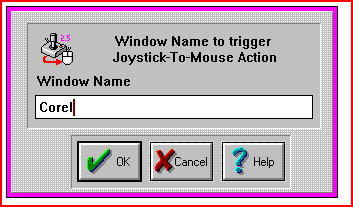 The Window Name appears within the Caption (Top) Bar of the Window. There must be an exact match of letters - Upper case / Lower case are ignored. The number of characters entered here determines the number of characters used to when Joystick-To-Mouse looks at the Window Name of the active window. If the Actual Window Name is longer than the Window Name entered here, the entire length of the Active Window Name will be searched for an occurrence of the Window Name entered. Note that if you enter only an M then ANY Window that has an M or m will match - you should enter the Name so it is long enough to be distinctive and only match with the intended Window. The Name match must be exact, so make sure to remove any specific application information / document names from the Window Name entered.