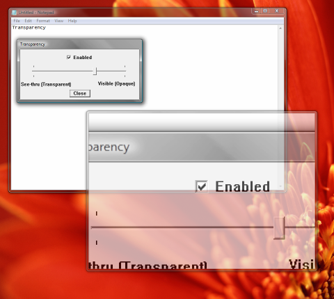 Transparency Level This option controls the visibility of The Magnifier's window. When you select this option one your menu it will bring you to a sliding bar with a window above it labeled "Enable". This window must be checked in order to to change the transparency of The Magnifier's window. Keyboard Shortcut: Alt-T