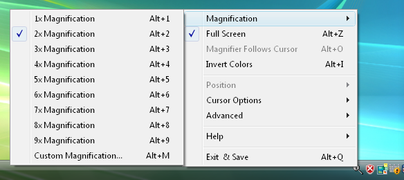 2x Magnification This selection will allow The Magnifier to show the images on your screen twice as large as they would normally appear.Keyboard Shortcut: Alt-2