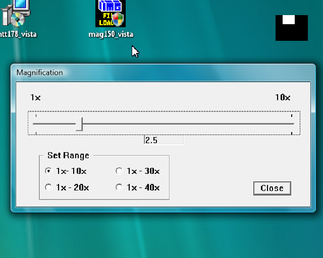 Custom Magnification This selection allows you to customize your screen magnification. The default settings on this menu will be a range of 1x-10x's the magnification of the original image, but if you wish to magnify more, there is a dialog labeled 'Set Range' which will allow you to chose 1x-10x's, 1x-20x's, 1x-30x's, or 1x-40x's. Once you have selected the proper range, move the slider to your desired magnification settings then click to close. Keyboard Shortcut: Alt-M