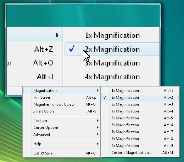 9x Magnification This selection will allow The Magnifier to show the image on your screen nine times as large as they would normally appear. Keyboard Shortcut: Alt-9