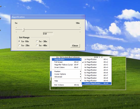 Custom Magnification This selection allows you to customize your screen magnification. The default settings on this menu will be a range of 1x-10x's the magnification of the original image, but if you wish to magnify more, there is a dialog labeled 'Set Range' which will allow you to chose 1x-10x's, 1x-20x's, 1x-30x's, or 1x-40x's. Once you have selected the proper range, move the slider to your desired magnification settings then click to close. Keyboard Shortcut: Alt-M