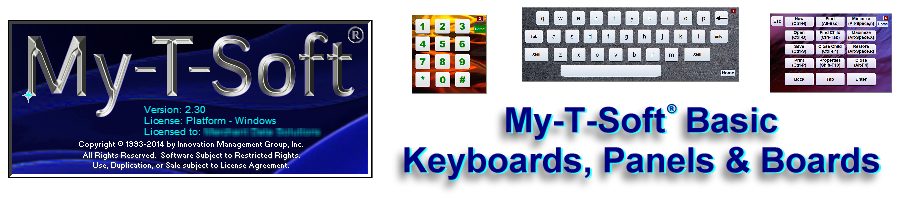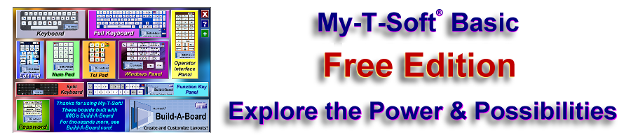 My-T-Soft® Basic is the Windows run-time component of IMG's Build-A-Board, which supports custom virtual on-sreen keyboards, keypanels and keypads. My-T-Soft Basic provides the program to display and operate these keyboards. When unlicensed, the Free Edition includes various popular keyboards, panels, and keypads. When licensed, My-T-Soft Basic includes US & International full on-screen keyboard layouts including access to thousands of layouts from the online database at Build-A-Board.com.