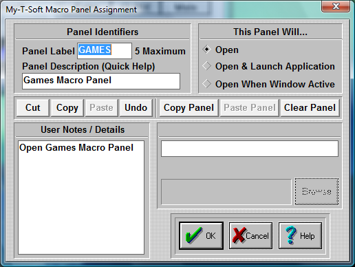 Click on this Radio-Button if you want to assign an application to this Macro Panel. Enter the application name and path in the edit box below (Application), or press Browse to select an application. You may also enter a Working Directory that will become the current directory when the Application is launched. When accessed, the panel will open & then automatically launch the application.