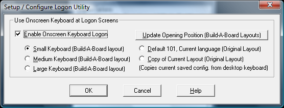 If you do not have Build-A-Board, and wish to change the opening position of the Small/Medium/Large Build-A-Board layouts, there is a basic utility called KBFLOGON.EXE in the LOGON folder. You can access this by clicking on Update Opening Position (Build-A-Board Layouts). By running this utility, you can change the opening X / Y position of the current selected Build-A-Board layout to match your screen orientation & resolution.
