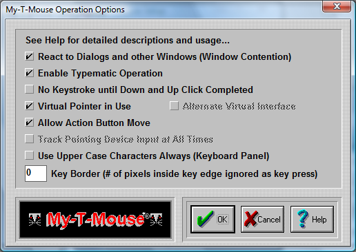 This setting should be set On if a the device used to move the mouse cursor (pointer) is not a standard mouse, or trackball. Any hardware device that interacts via a "device driver" with Windows should not be considered a Virtual Pointer (unless the implementation does not fully emulate a standard mouse [which is more common than otherwise]). Various Assistive Technology devices such as cameras or lasers that track the eye, other biometric sensors, or other software based translation interfaces (such as the MouseKeys in Microsoft's Accessibilities options) when used should have the Virtual Pointer setting On. This feature forces My-T-Mouse to operate slightly differently for "Clicks" (button down, button up), and during moving the My-T-Mouse window.