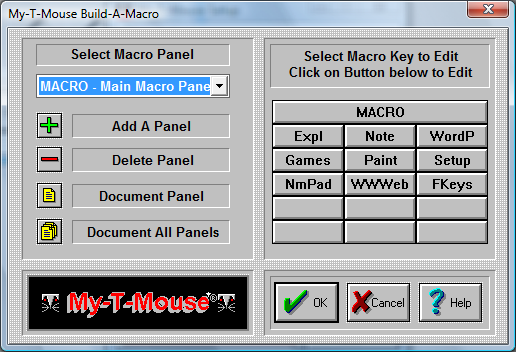 Advanced Notes: The panels included have been setup with various options to help illustrate the functions available. They may be changed or deleted as you desire. When running My-T-Mouse, clicking the top panel of the Main Macro panel will open My-T-Mouse Setup and go directly to Build-A-Macro. This is useful for fast macro panel / button changes. Macro Panels may be nested up to ten levels. Clicking on the top button of a nested panel will return to the previous panel, which is a shortcut for advanced users. In general, it is better to use a button to indicate the panel to open.