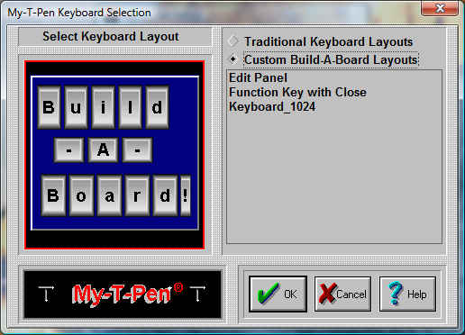 There are a few sample, custom Build-A-Board Layouts available. Additional Build-A-Board layouts can be created, and when placed in the Installation Folder will be added to this list. When selected, the KEYBOARD.KBF in the users configuration folder is replaced with the selected layout. When My-T-Pen is run, the layout is recognized, and the Build-A-Board compatible run-time (MYTSOFT2.EXE) is used to operate with the version 2.x keyboard layouts.