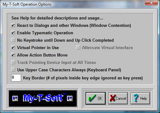 This setting should be set On if a the device used to move the mouse cursor (pointer) is not a standard mouse, or trackball. Any hardware device that interacts via a "device driver" with Windows should not be considered a Virtual Pointer (unless the implementation does not fully emulate a standard mouse [which is more common than otherwise]). Various Assistive Technology devices such as cameras or lasers that track the eye, other biometric sensors, or other software based translation interfaces (such as the MouseKeys in Microsoft's Accessibilities options) when used should have the Virtual Pointer setting On. This feature forces My-T-Soft to operate slightly differently for "Clicks" (button down, button up), and during moving the My-T-Soft window.
