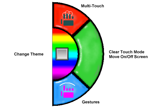 The large Green touch area will clear (turn off) the current touch mode (Multi-Touch or Gestures) and operate in the normal mode (Note: Flicks are supported in normal mode). If the current mode is currently "normal" (no Multi-Touch or Gestures), then a touch will move My-T-Soft off-screen. When off-screen, a touch will bring My-T-Soft back onscreen.