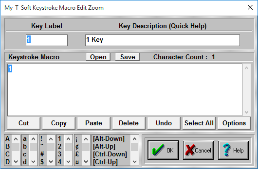The Open and Save buttons are available as conveniences for developers using the MACROBAT and other IMG utilities. These will use the Zoom Edit screen as an the Editing area - Open will open, read, and place the contents of a previously Saved Macro into the Zoom Edit area. The KMF (Keyboard Macro File) format is used.