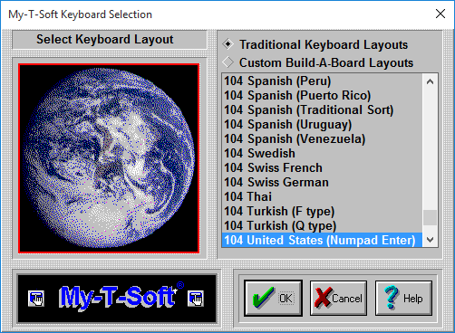 Note: Some layouts date back to Windows 3.1/Windows 95. These layouts are labeled "(old)". For later releases of Windows, these layouts may not match changes to the current keyboard layouts in Windows. Some layouts may only operate correctly under Windows 95/98 - refer to the layouts available in your version of Windows to select which layout to use in My-T-Soft.