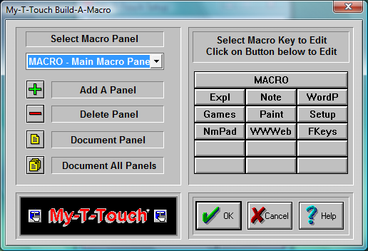 Advanced Notes: The panels included have been setup with various options to help illustrate the functions available. They may be changed or deleted as you desire. When running My-T-Touch, clicking the top panel of the Main Macro panel will open My-T-Touch Setup and go directly to Build-A-Macro. This is useful for fast macro panel / button changes. Macro Panels may be nested up to ten levels. Clicking on the top button of a nested panel will return to the previous panel, which is a shortcut for advanced users. In general, it is better to use a button to indicate the panel to open.