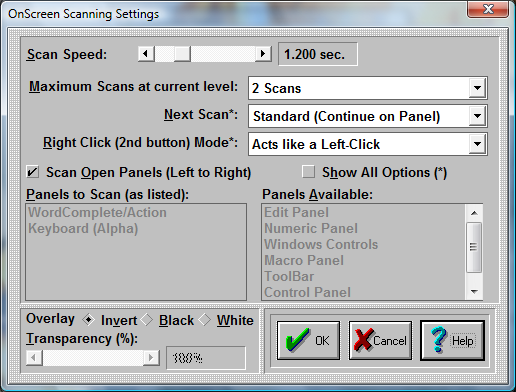The scanning capabilities of OnScreen provide a single-click option to access all panels and keys. To address different user capabilities, these settings provide both basic and advanced options. In most cases, the Scan Delay setting (which controls the scanning step speed) will be sufficient for basic users. If a second button is available (e.g. the Right-Click), there are several options available to control scanning actions when the right-click button is pressed. The Scan Overlay display controls the basic color (color inverted, black, or white) and the transparency level.