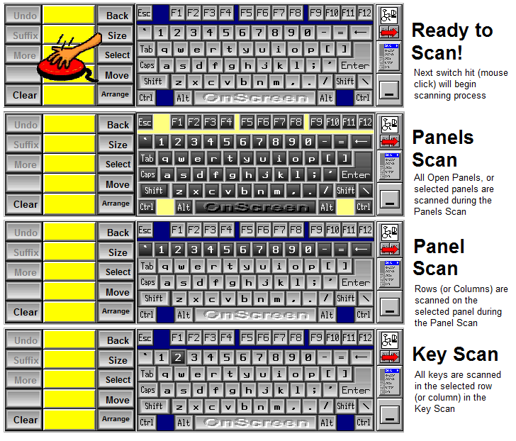 OnScreen uses a "Ready to Scan!" image of a hand over a large red switch to indicate scanning is enabled and ready to start. The first switch hit (mouse click) will begin the scan process. The Ready to Scan image always overlays the first panel to be scanned.