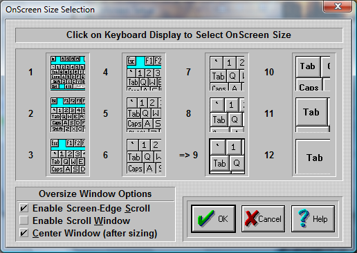 The size Dialog box allows you to select which size OnScreen will be displayed each time you start the program.