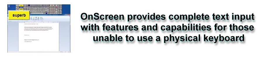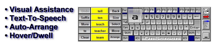 OnScreen with WordCompleteOnscreen Keyboard forAdaptive Computer Access NeedsOnScreen with Word Complete is the latest Assistive Technology version of IMG's highly respected My-T-Soft onscreen keyboard utilities. Windows 11 / 10 / 8.1 / 8 / 7 (32 & 64 bit) is Now Available!