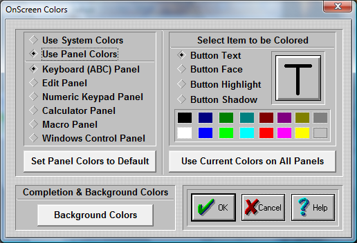 Select "Use Panel Colors" to use OnScreen Colors. OnScreen colors allows you to customize OnScreen by coloring each panel's keys and buttons.