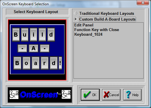 There are a few sample, custom Build-A-Board Layouts available. Additional Build-A-Board layouts can be created, and when placed in the Installation Folder will be added to this list. When selected, the KEYBOARD.KBF in the users configuration folder is replaced with the selected layout. When OnScreen is run, the layout is recognized, and the Build-A-Board compatible run-time (MYTSOFT2.EXE) is used to operate with the version 2.x keyboard layouts.
