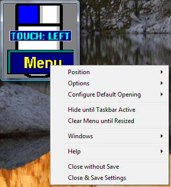 If the Menu button is not visible (Clear Menu Until Resized option), you can resize the TouchRight Utilities window to refresh and show the Menu button. Optionally (if enabled), there will be a taskbar icon in the tray (near clock and other small icons) that can be used to access the Menu.