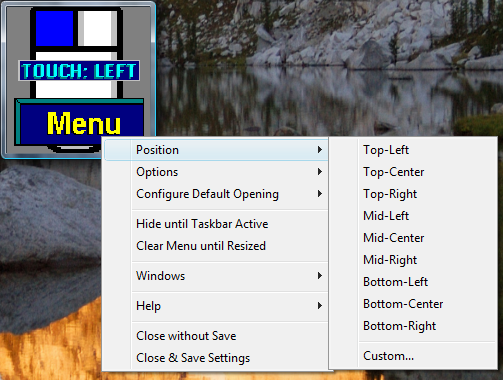 When one of the 9 fixed options is selected, the entire TouchRight Utilities window will be moved to the screen position indicated. You also have the option of using the sizing borders to change the size and/or position of TouchRight Utilities. You may click & drag the borders to position the TouchRight Utilities window anywhere on your screen at any size.