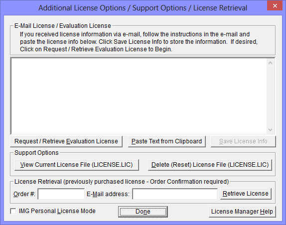 The License Retrieval Option will retrieve License Information from IMG's Website for electronically purchased licenses. The Order Confirmation Number and Order E-mail is required (which appear on the Order Confirmation page provided after successfully placing an on-line order, and are provided separately via an Order Confirmation E-mail).