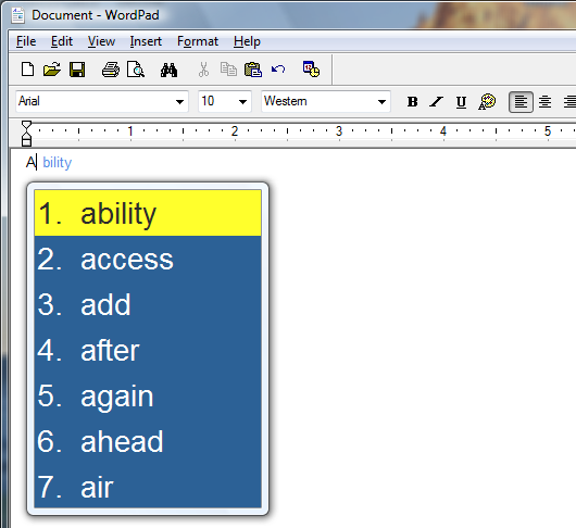 WordComplete is a program that monitors user input, and predicts words as the user types letters. As soon as you type a character, a small window appears which displays a list of possible words or phrases (Word Candidate list). The most frequently used words are displayed first. To further assist this process, an optional second window (inline window) can be displayed, and appears next to the letters that are typed. The inline window shows the most likely WordComplete candidate "inline" (i.e. shows the ending of the word). This visually helps the user see what their completed word would look like, using the most likely WordComplete candidate.